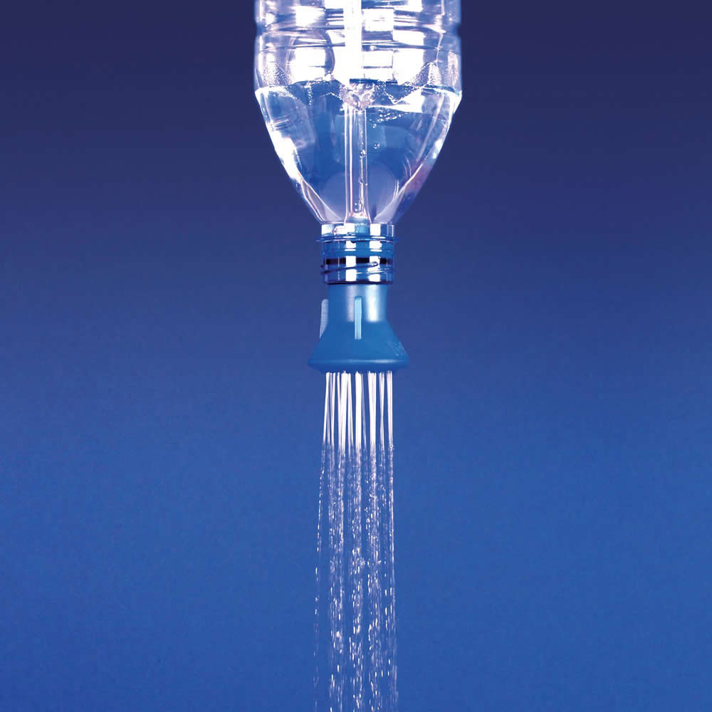 The Bottleshower multiplies the running time of bottled water by up to 6 to 10 times compared to poured water making washing more effective and controllable