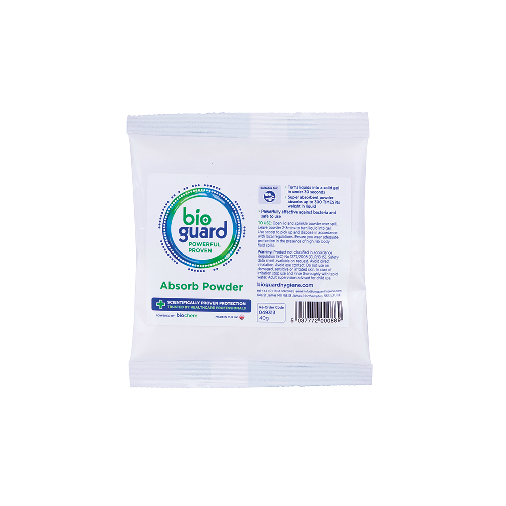 • Super absorbent powder designed to be used in any environment where you need to quickly, hygienically and safely clean up body fluid spills or any other liquid spill.